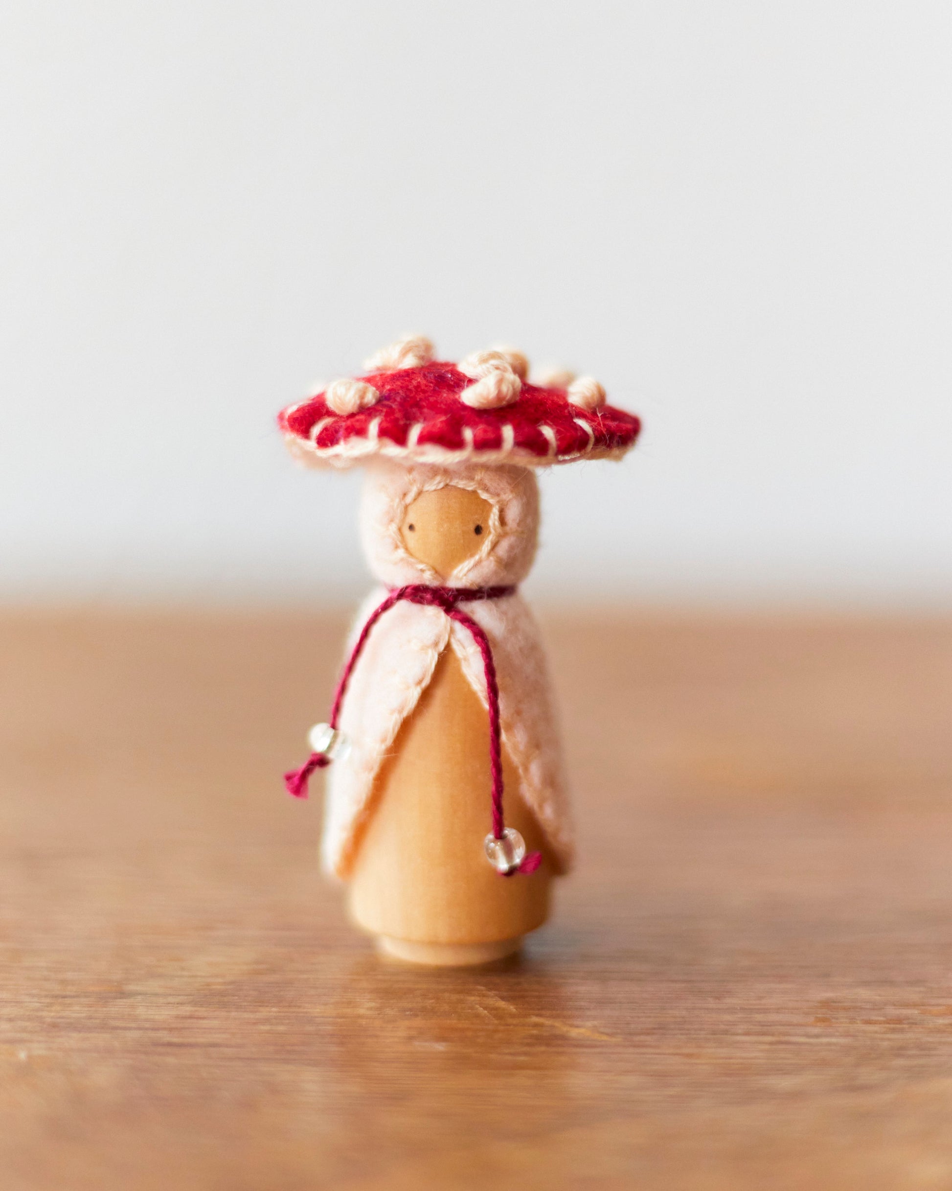Each Wooden Gnome is carefully hand-polished with beeswax, then gently filled with wool. We finish each one by fitting their felted coat and tying their beaded string—bringing them to life with warmth and intention.