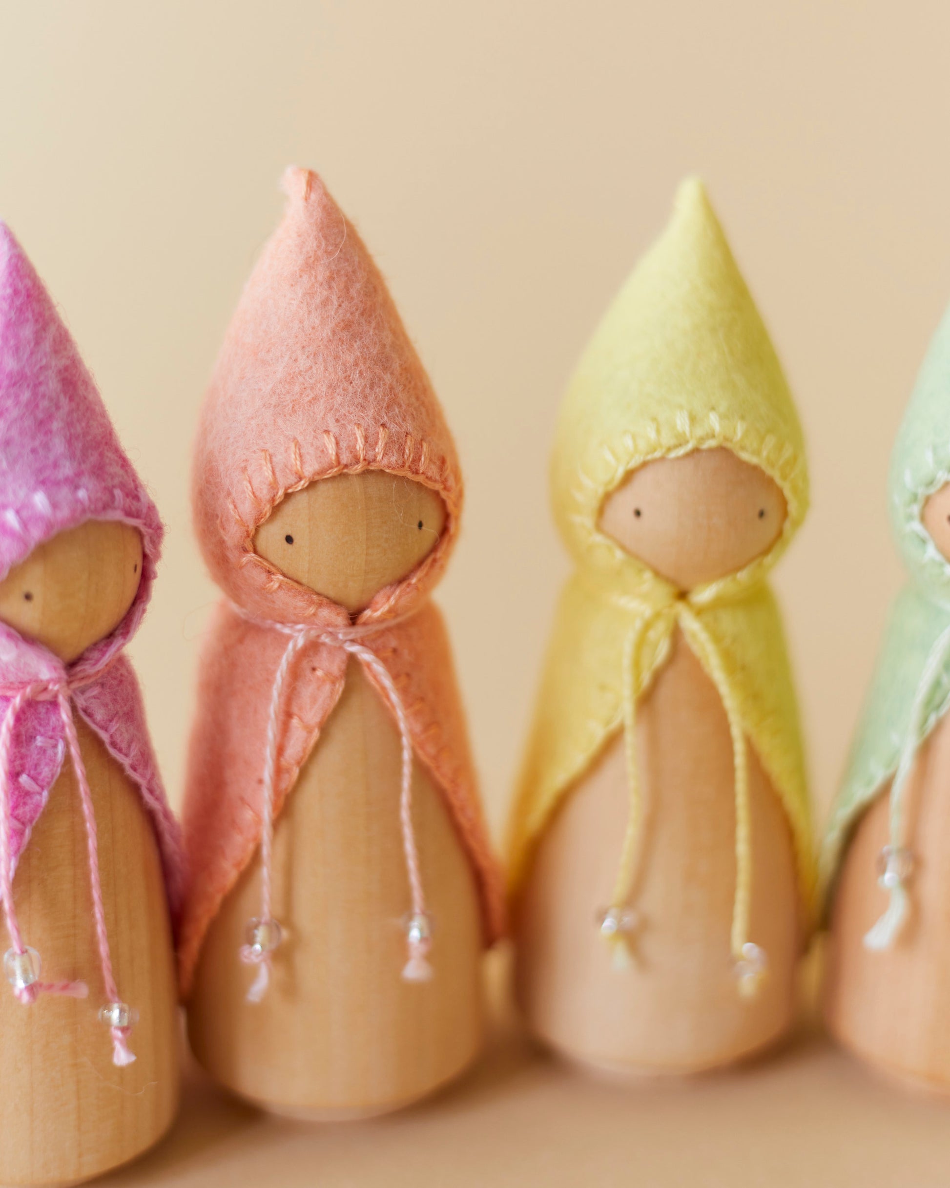 From sanding and polishing the wood to stitching tiny felt coats and tying each beaded string, every step is slow, intentional, and filled with care. No two are exactly alike, making each gnome a one-of-a-kind companion for magical, open-ended play and the stories still to come.